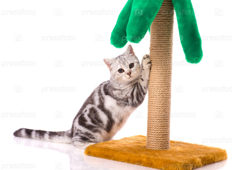 Котенок коготками дерет ствол игрушечной пальмы на белом фоне