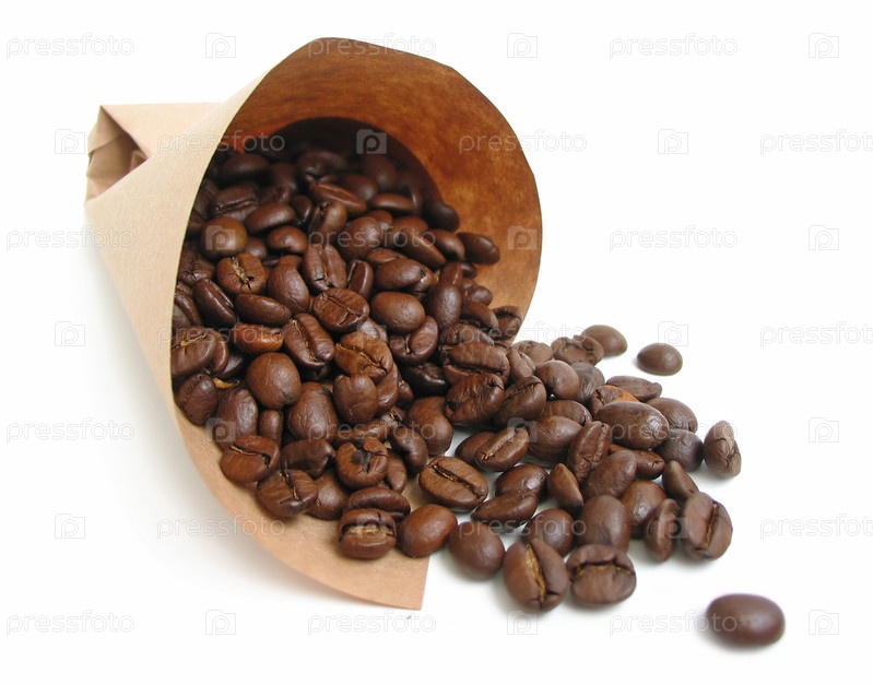 Кофейные бобы, разливающиеся из бумажного пакета