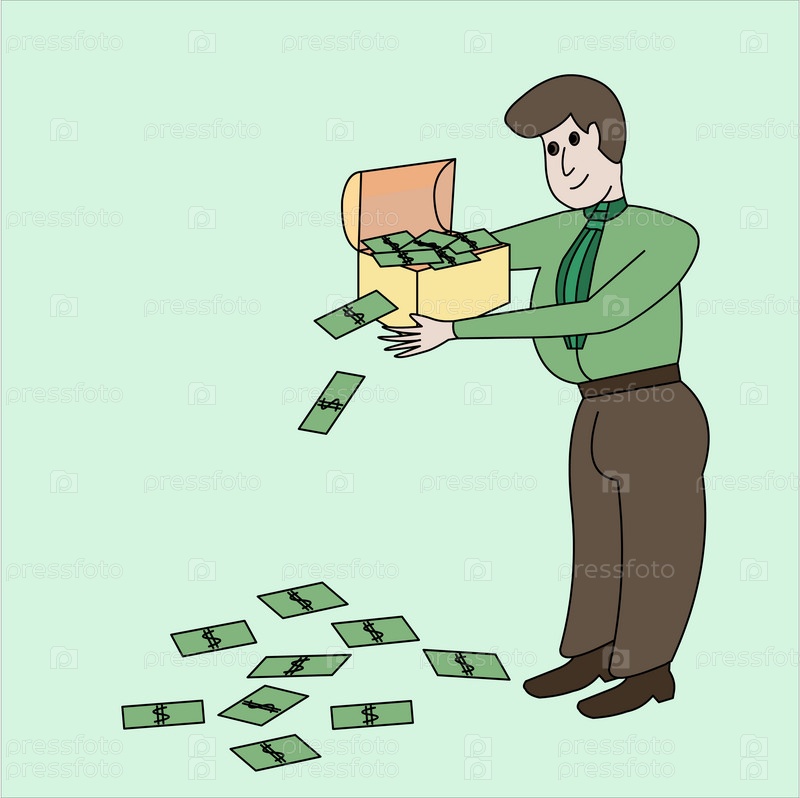 Богач держит сундук с деньгами, падающими на пол