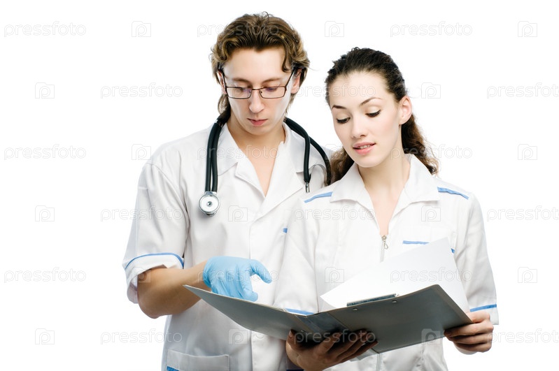 Два молодых врача на белом фоне