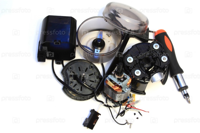 Элементы кофейной мельницы, демонтированные после разрыва на белом фоне