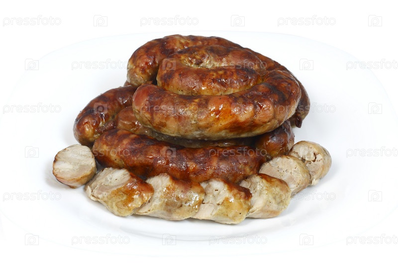 Кольца жареной колбасы на белом фоне