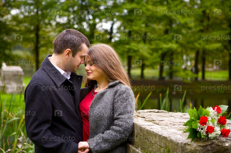 Молодая влюбленная пара, гуляющая в парке