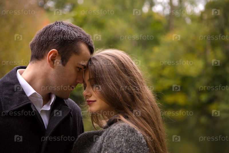 Молодая влюбленная пара, гуляющая в парке