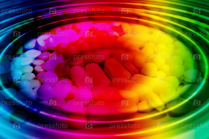 Таблетки под водой, окрашенной в цвета радуги