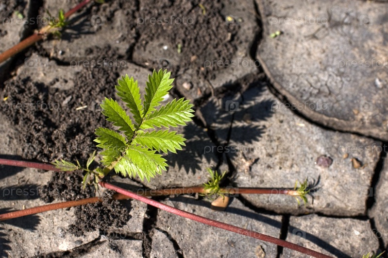 Зеленый куст на фоне сухой земли