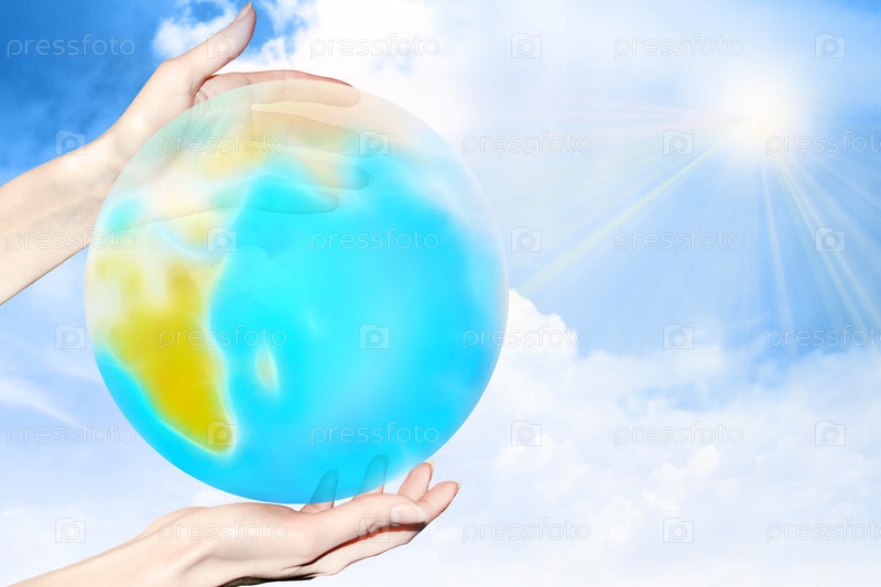 Руки держат макет земного шара на фоне облачного неба