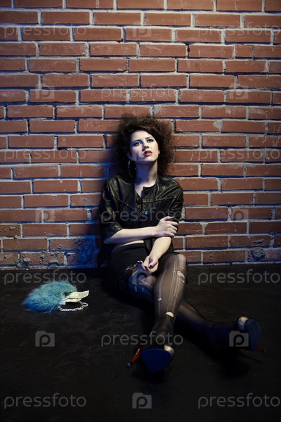 Девушка легкого поведения сидит на полу возле кирпичной стены