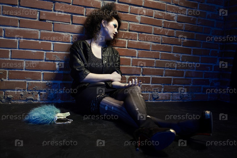 Девушка легкого поведения сидит на полу возле кирпичной стены
