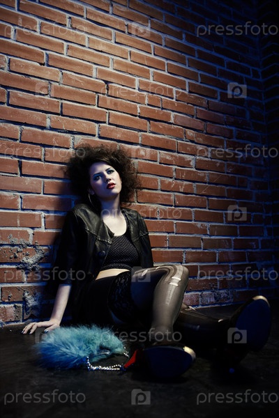 Девушка легкого поведения сидит на полу возле кирпичной стены