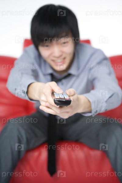 Улыбающийся молодой человек в серой рубашке смотрит телевизор