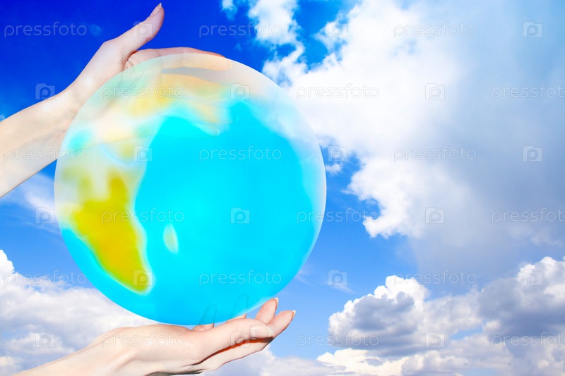 Руки держат макет земного шара на фоне облачного неба