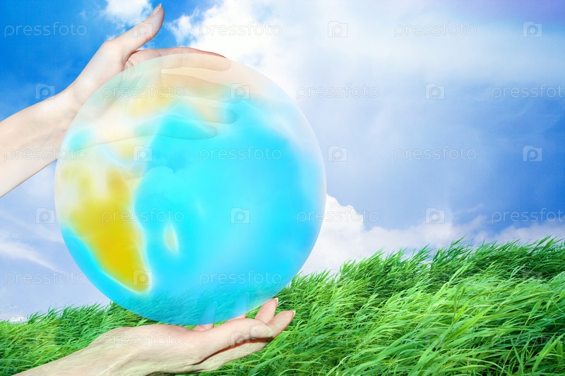 Руки держат макет земного шара на фоне зеленой травы и облачного неба