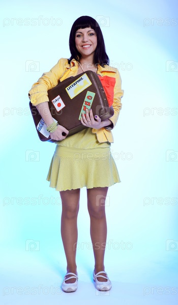 Молодая девушка держит чемодан двумя руками