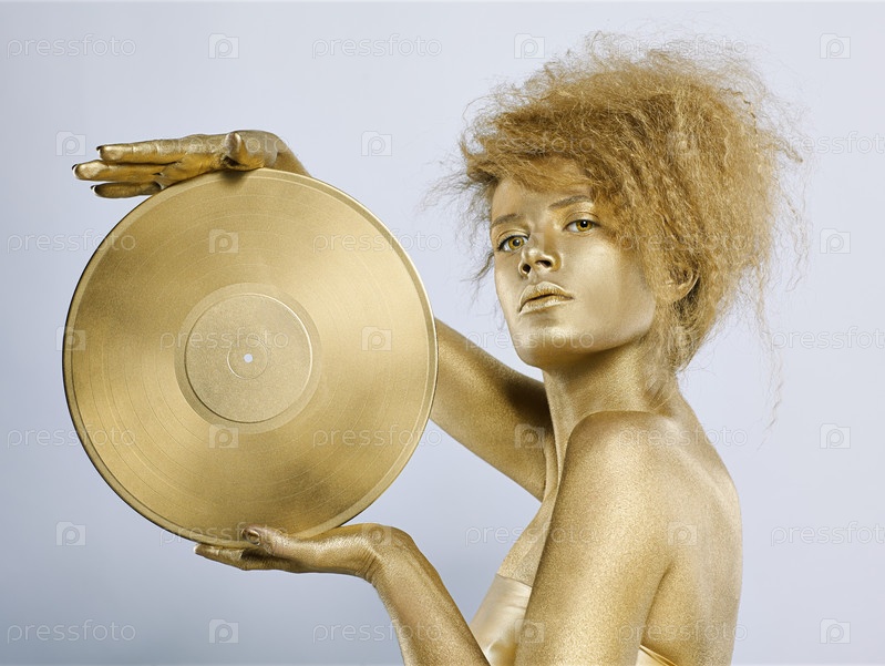 Молодая девушка в золотистом гриме держит виниловую пластинку