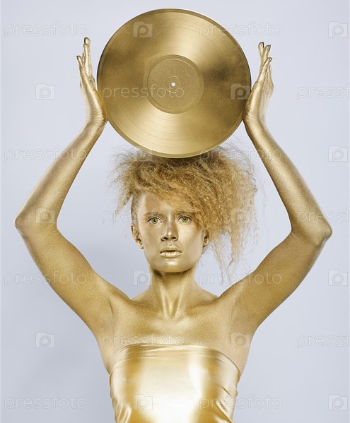 Молодая девушка в золотистом гриме держит над головой виниловую пластинку
