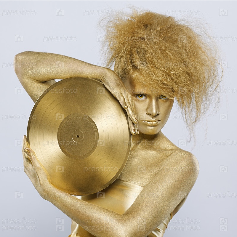Молодая девушка в золотистом гриме держит виниловую пластинку