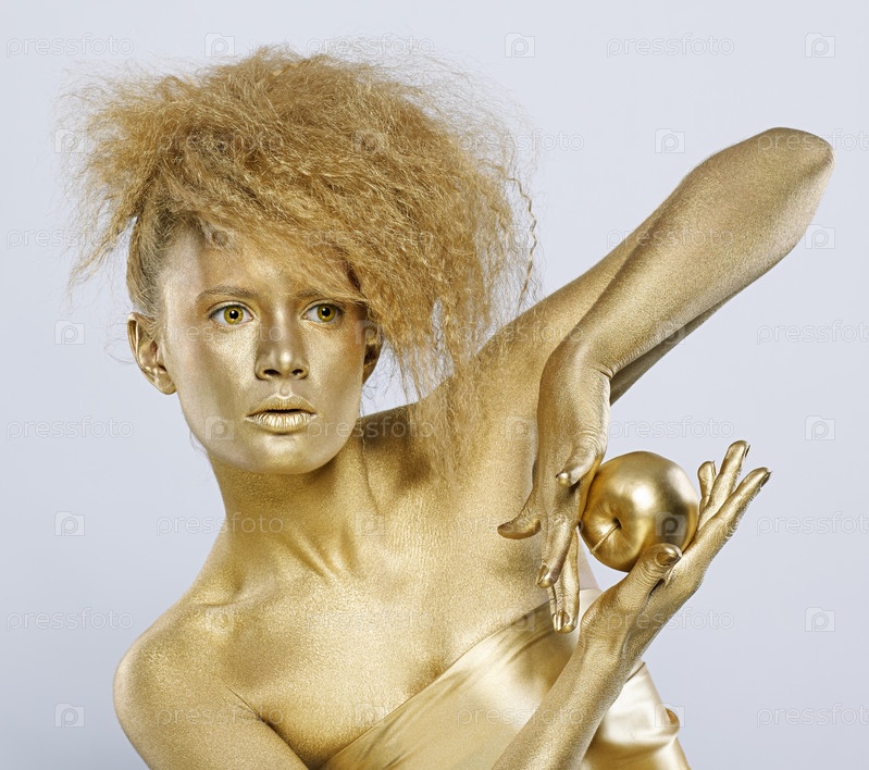 Молодая девушка в золотистом гриме с золотым яблоком