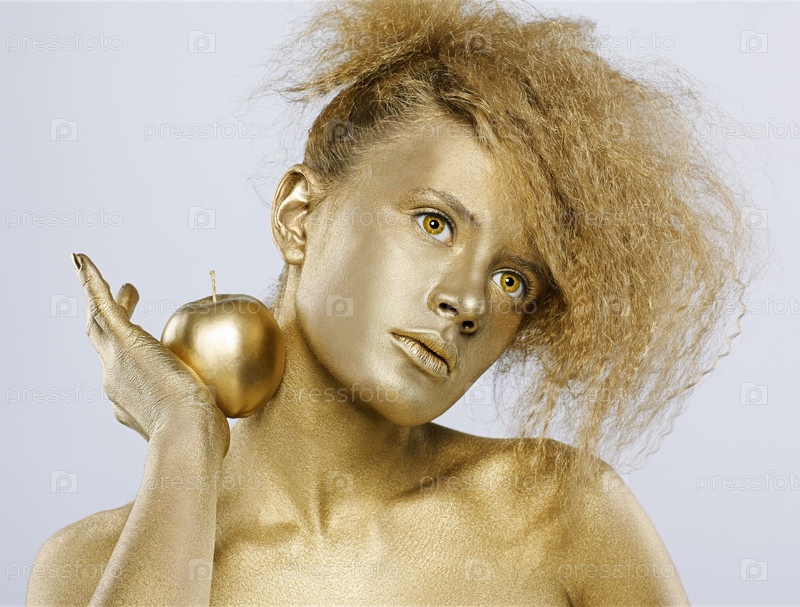 Молодая девушка в золотистом гриме с золотым яблоком