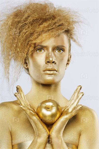 Молодая девушка в золотистом гриме с золотым яблоком