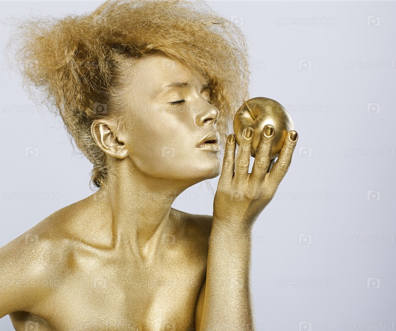 Молодая девушка в золотистом гриме с золотым яблоком