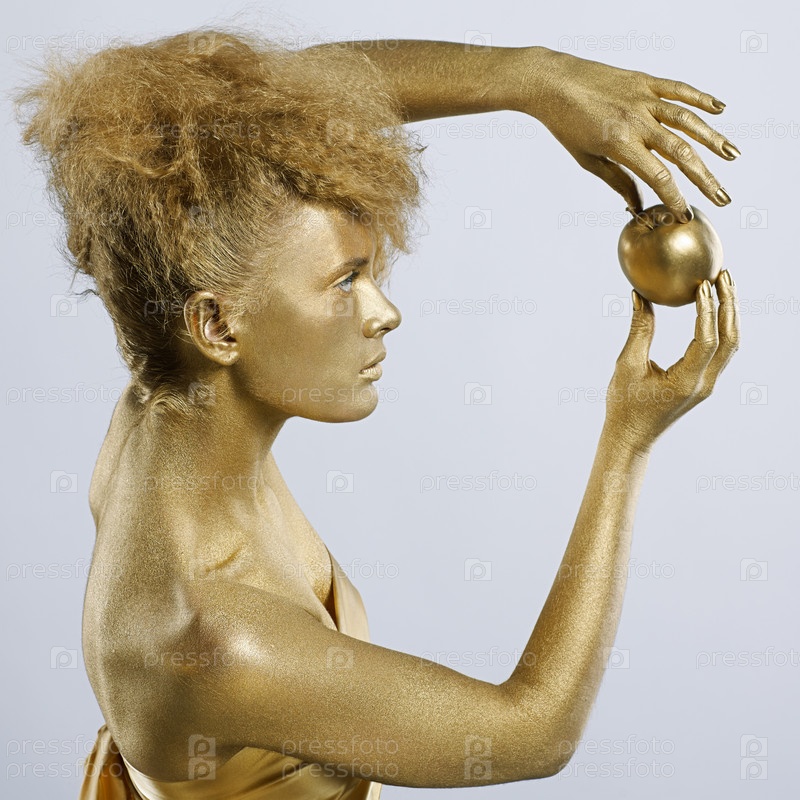 Молодая девушка в золотистом гриме с золотым яблоком
