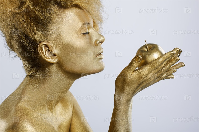 Молодая девушка в золотистом гриме с золотым яблоком