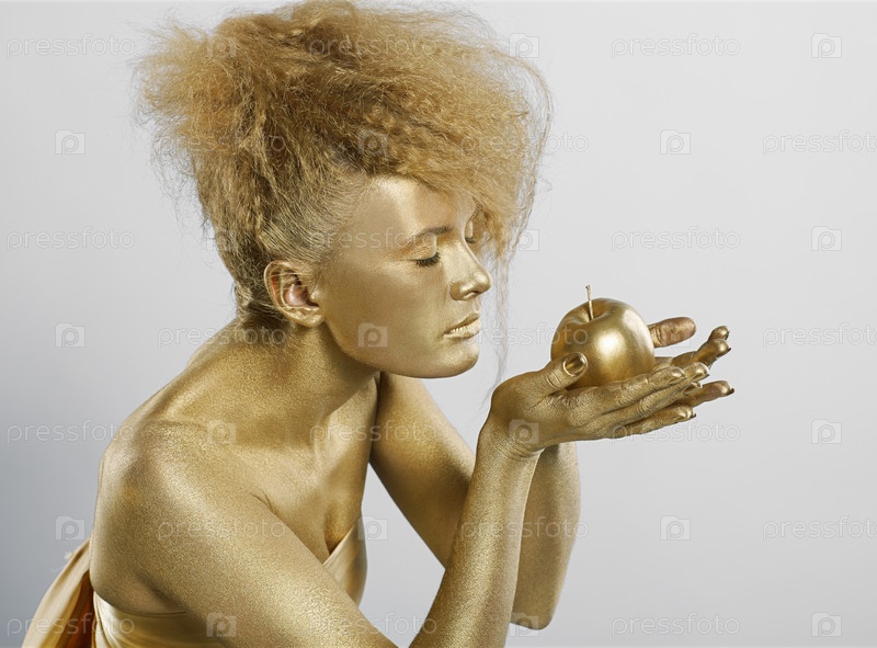 Молодая девушка в золотистом гриме с золотым яблоком