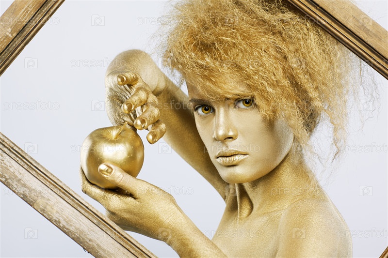 Молодая девушка в золотистом гриме с золотым яблоком в деревянной рамке