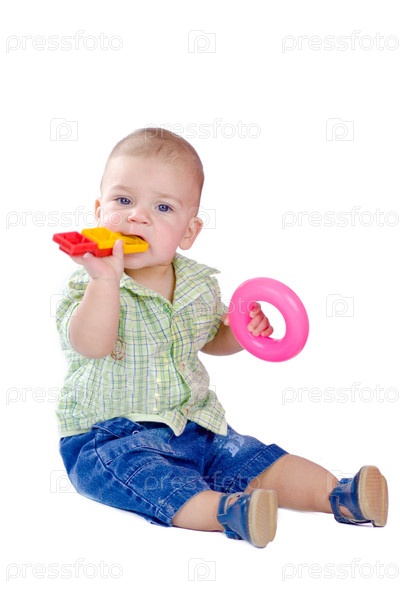 Маленький ребенок, сидящий на полу с игрушками в руках