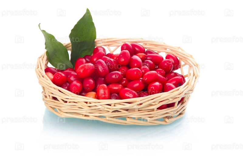 Ягоды клюквы с листьями в корзинке на белом фоне