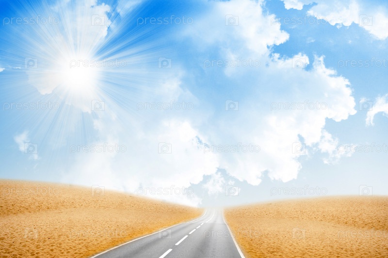 Солнце на фоне голубого неба с облаками и дорога, уходящая вдаль