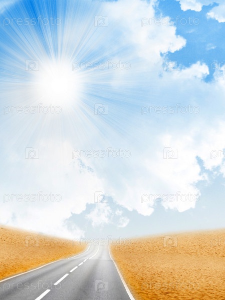 Солнце на фоне голубого неба с облаками и дорога, уходящая вдаль