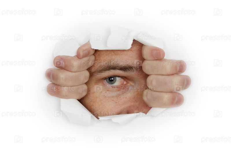 Человек смотрит сквозь дыру в бумаге