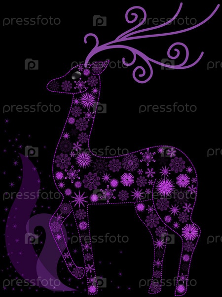 Красивый рождественский олень из фиолетовых снежинок на черном фоне