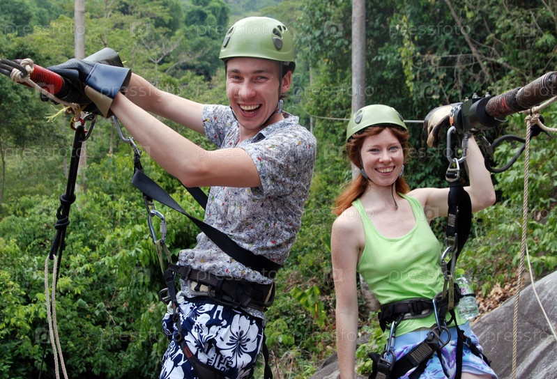 Счастливая пара после поездки на кабельном траке