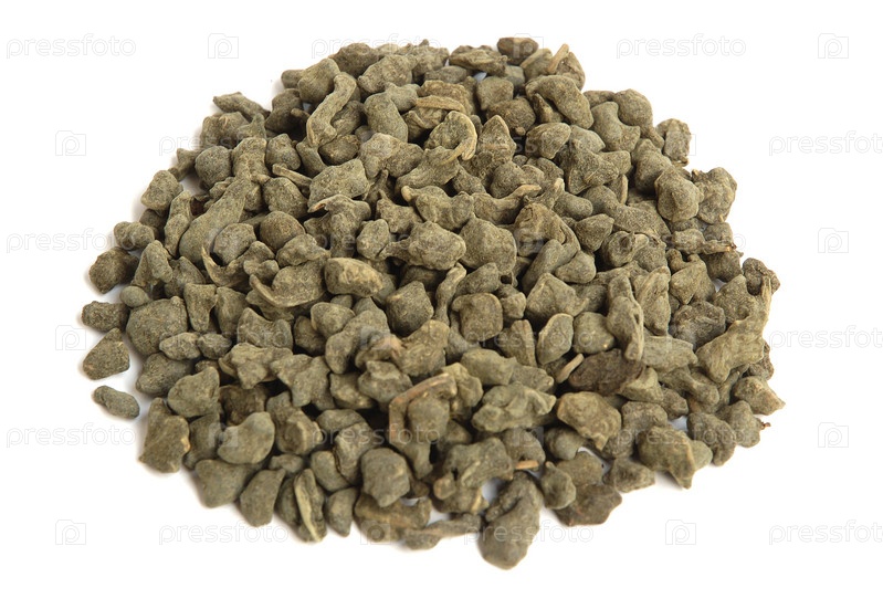 Ароматические зеленые чайные листья с женьшенем на белом фоне