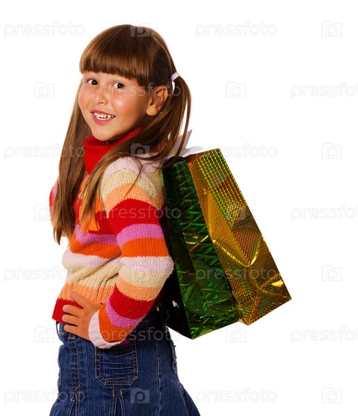 Улыбающаяся девочка с подарочными пакетами в руках на белом фоне