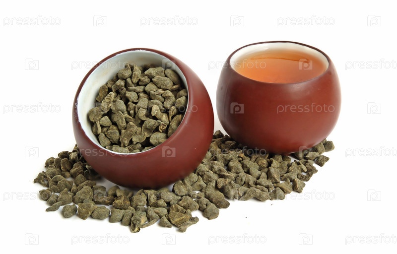 Чашка сушеных листьев зеленого чая с чашкой чая