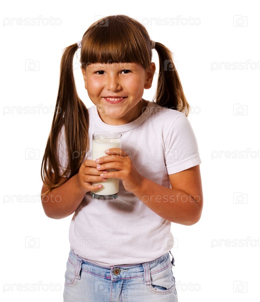 Портрет маленькой улыбающейся девочки со стаканом молока