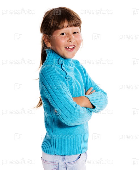 Портрет маленькой счастливой девочки на белом фоне