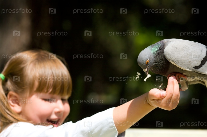 Маленькая счастливая девочка, кормящая голубя с руки