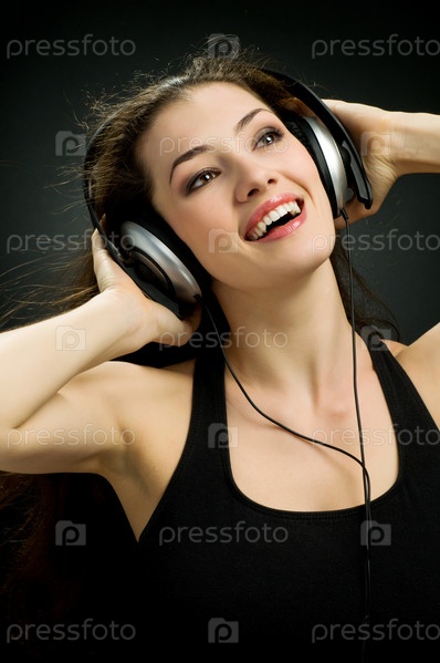 Девушка в наушниках на черном фоне