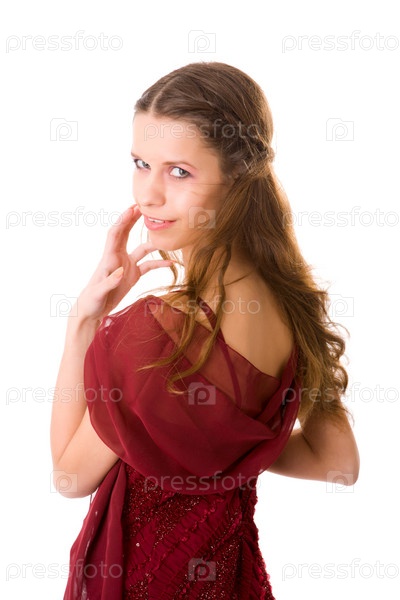 Красивая молодая девушка в красном платье на белом фоне