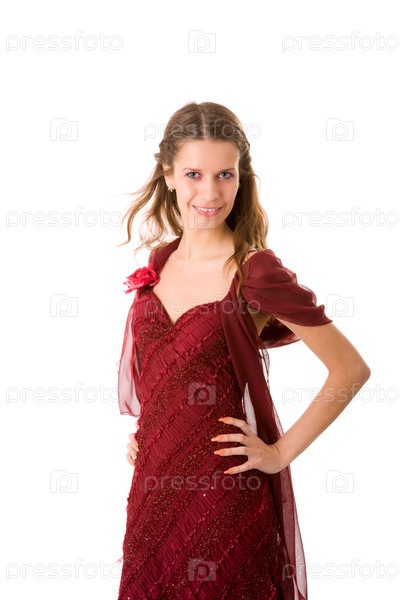 Портрет красивой девушки в красном на белом фоне