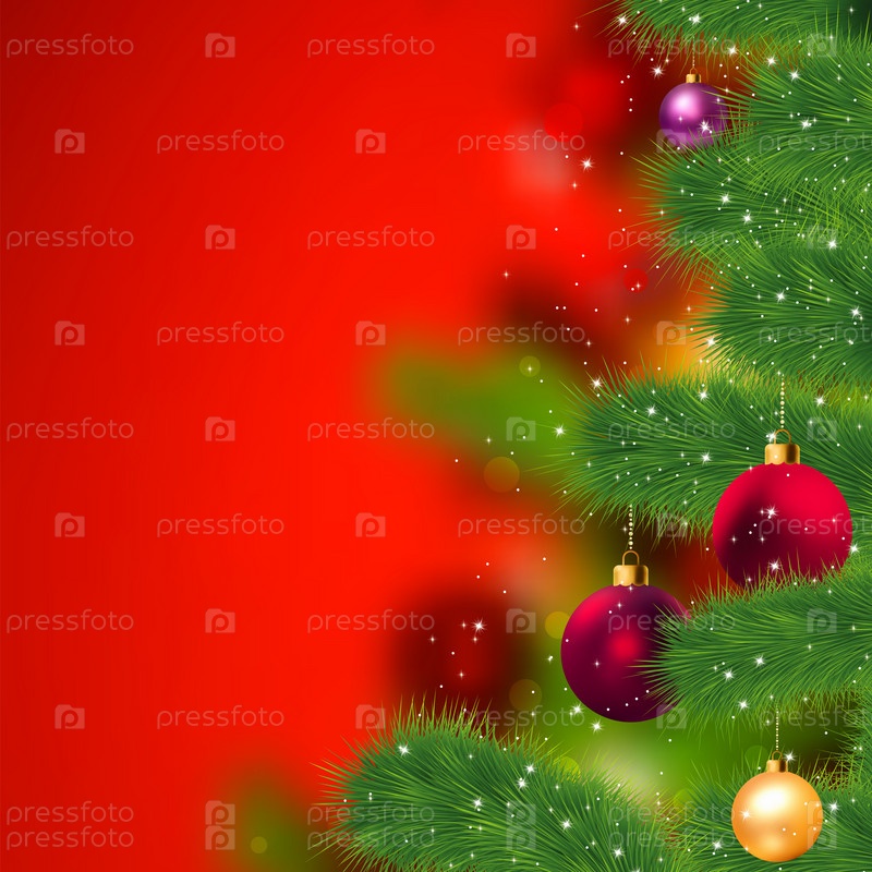Елочные игрушки на елке на красном фоне
