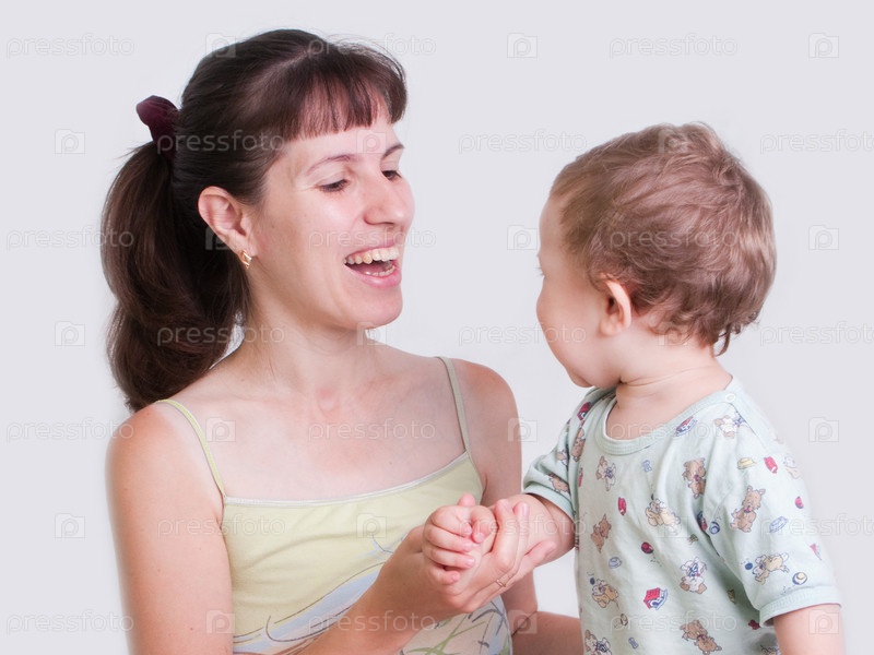 Улыбающаяся мать и маленький ребенок в семейном счастье