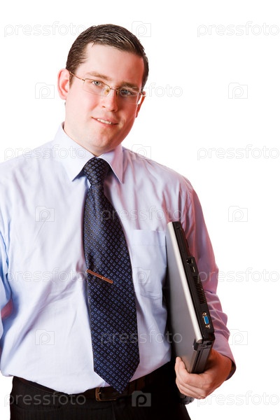 Портрет улыбающегося бизнесмена с ноутбуком на белом фоне