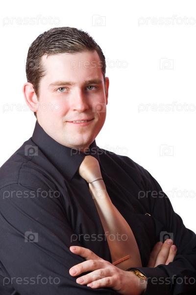 Портрет улыбающегося бизнесмена в черной рубашке на белом фоне