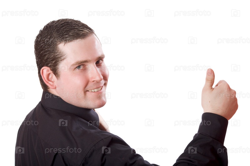 Портрет улыбающегося бизнесмена в черной рубашке на белом фоне, вид со спины